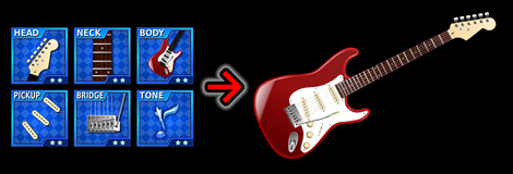 アイテムは、HEAD、NECK、BODY、PICKUP、BRIDGE、TONE の6種類があり、それぞれを組合せることによってさまざまなデザインのギターを作ることができます。