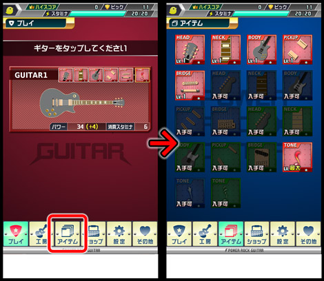本アプリにおけるアイテムは、ギターをカスタマイズするために使います。