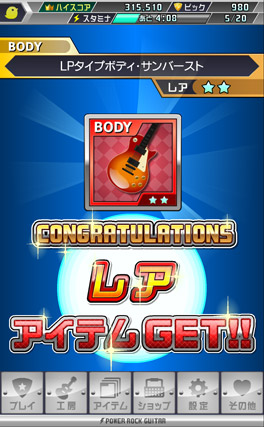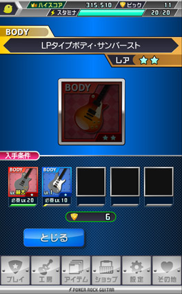 例えば、上に表示したアイテム“LPタイプボディ・サンバースト”は、6ピックの消費と、2つのアイテムをそれぞれの必要Lvまで育成することが条件となっています。