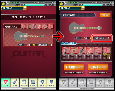 スタミナの消費量は、使用するギターを構成するアイテムによって変動します。 初期に入手できるレア度の低いアイテムは、性能が高くない代わりに消費スタミナも抑えられています。