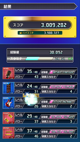 ▲演奏モード終了後の結果画面。 BODYアイテムがレベルアップし、その分、スタミナが2回復しています。 演奏モードで高得点を出せば、アイテムがレベルアップしてスタミナが回復する頻度も上がるので、遊べる回数も増えます。