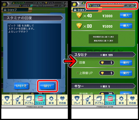 攻略が進んでギターがグレードアップすると、その分、消費スタミナも増加するので、回復が間に合わず、思うように遊べなくなってしまいます。そんな時は、アプリ内の仮想通貨「ピック」を消費し、強制的にスタミナを回復させることもできます。