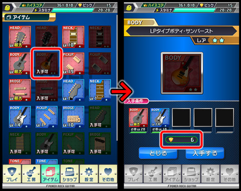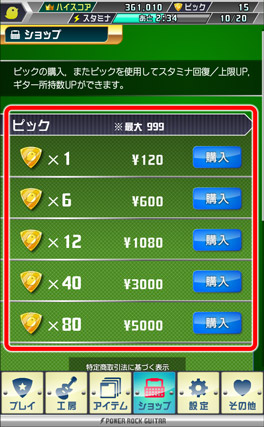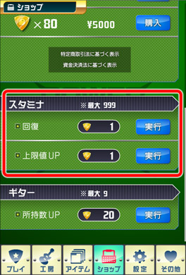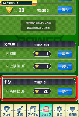 ギターの所持数アップは、スタミナ操作と同じく“ショップ”画面で行うことができます。