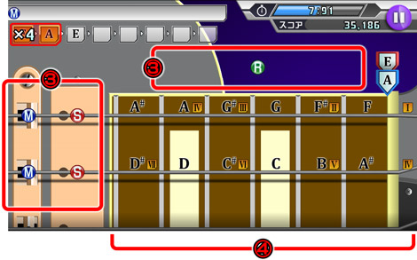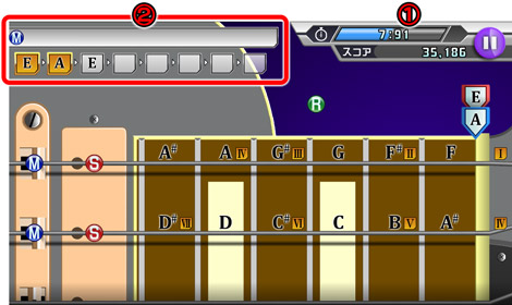▲演奏画面(写真は “LIVEモード” の演奏画面です) ① 制限時間/スコア情報エリア: